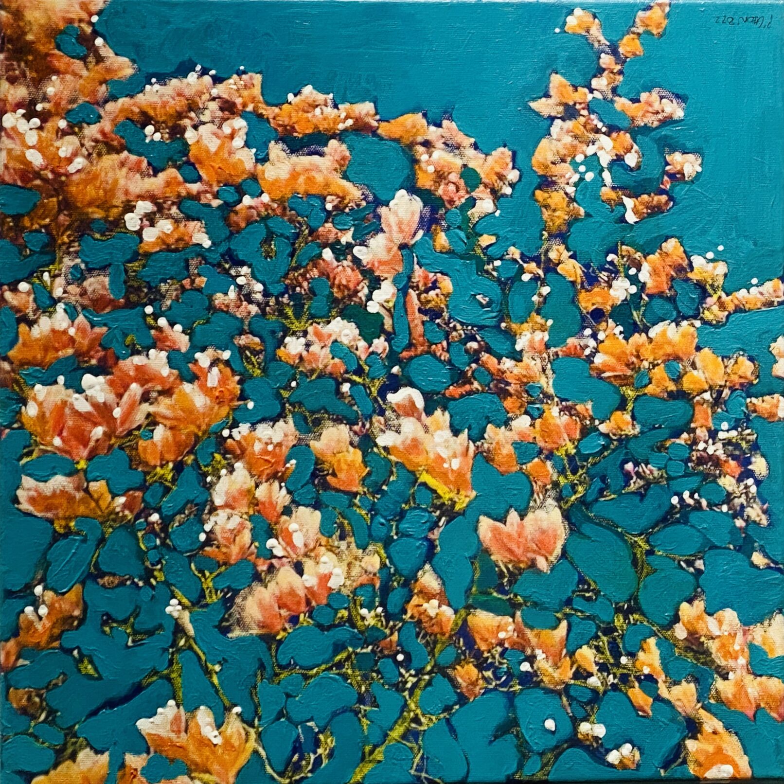La collection LoveMagnolia Green Orange de Paule Caron est déclinée en fresque murale de 35 toiles 40 cm x 40 cm. Toiles Canvas vinyles avec impression numérique, acrylique et pastels.