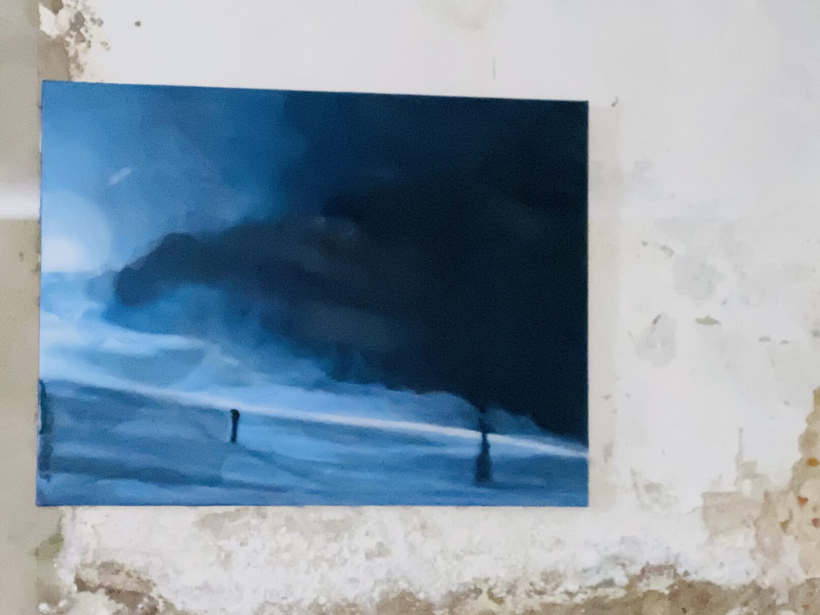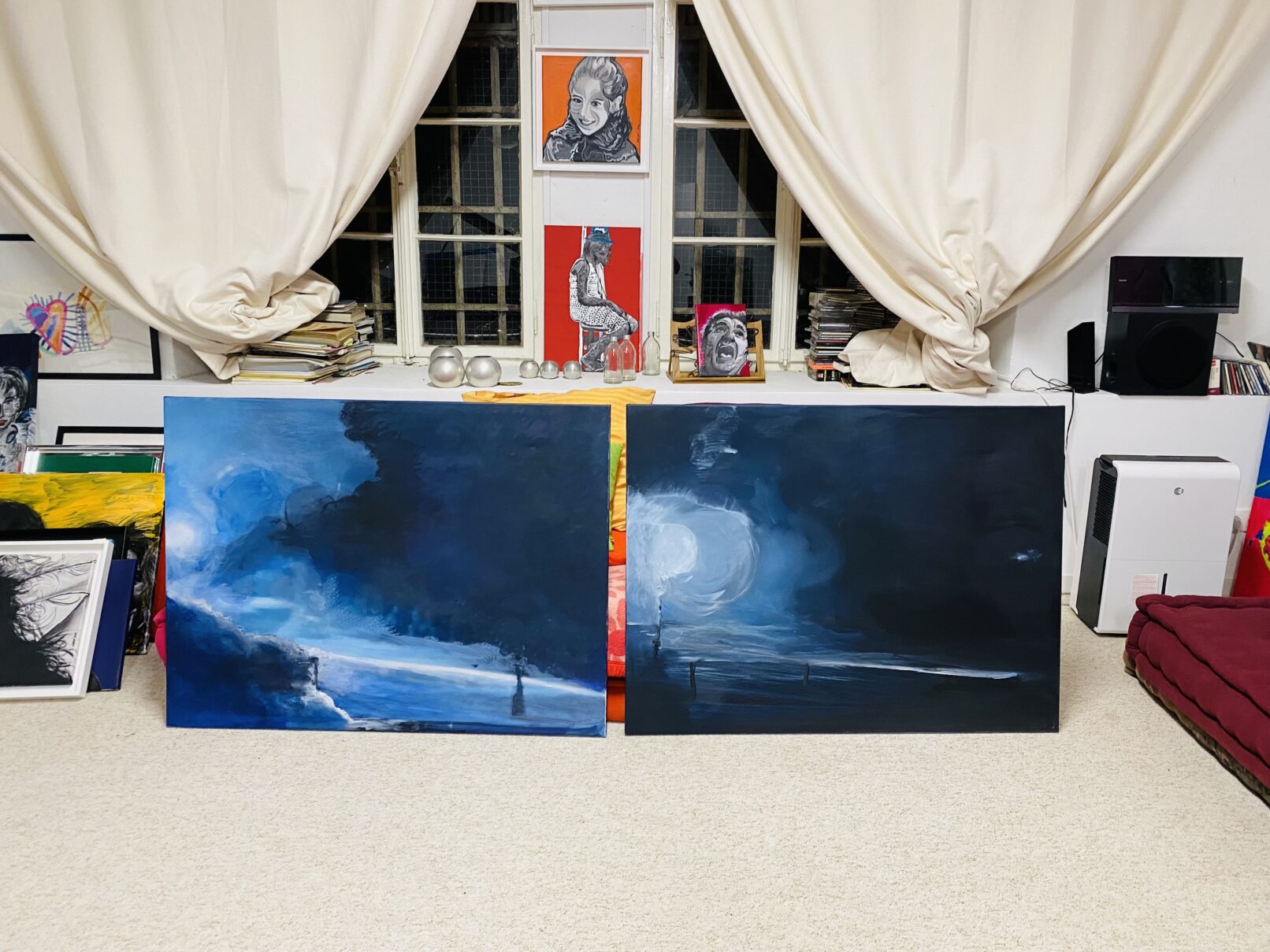Immersion marine au sein des embruns, ces 2 toiles constituent un voyage dans l’océan tout en restant à quai. Le travail de l’oeuvre a été réalisé en matériaux mixtes acrylique/gouache/fusain. Le travail de la couleur a été fait à l’éponge. Les diverses teintes de bleu toutes travaillées en détail avec leur propre pigment permettent une perception unique du mouvement des vagues jusqu’à l’idée de transmettre l’énergie iodée d’un océan qui claque sur les rives du continent..
